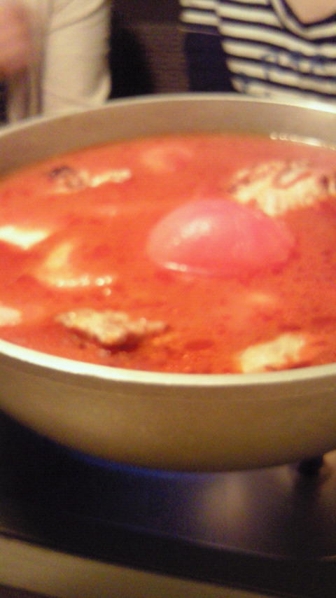 トマト鍋ですって!まるごとトマト入ってて、美味しい(*´∇`)なんか、スープスパのスパゲッティ抜きで野菜と肉食べた感じ(?)
