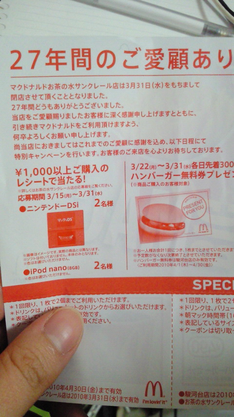 もうすぐお店なくなっちゃうのかー。初バイトのお店だったし、それから2年もやってきたから、あんまりマック自体が好きなじゃないけど…思い入れはあります(^ω^)