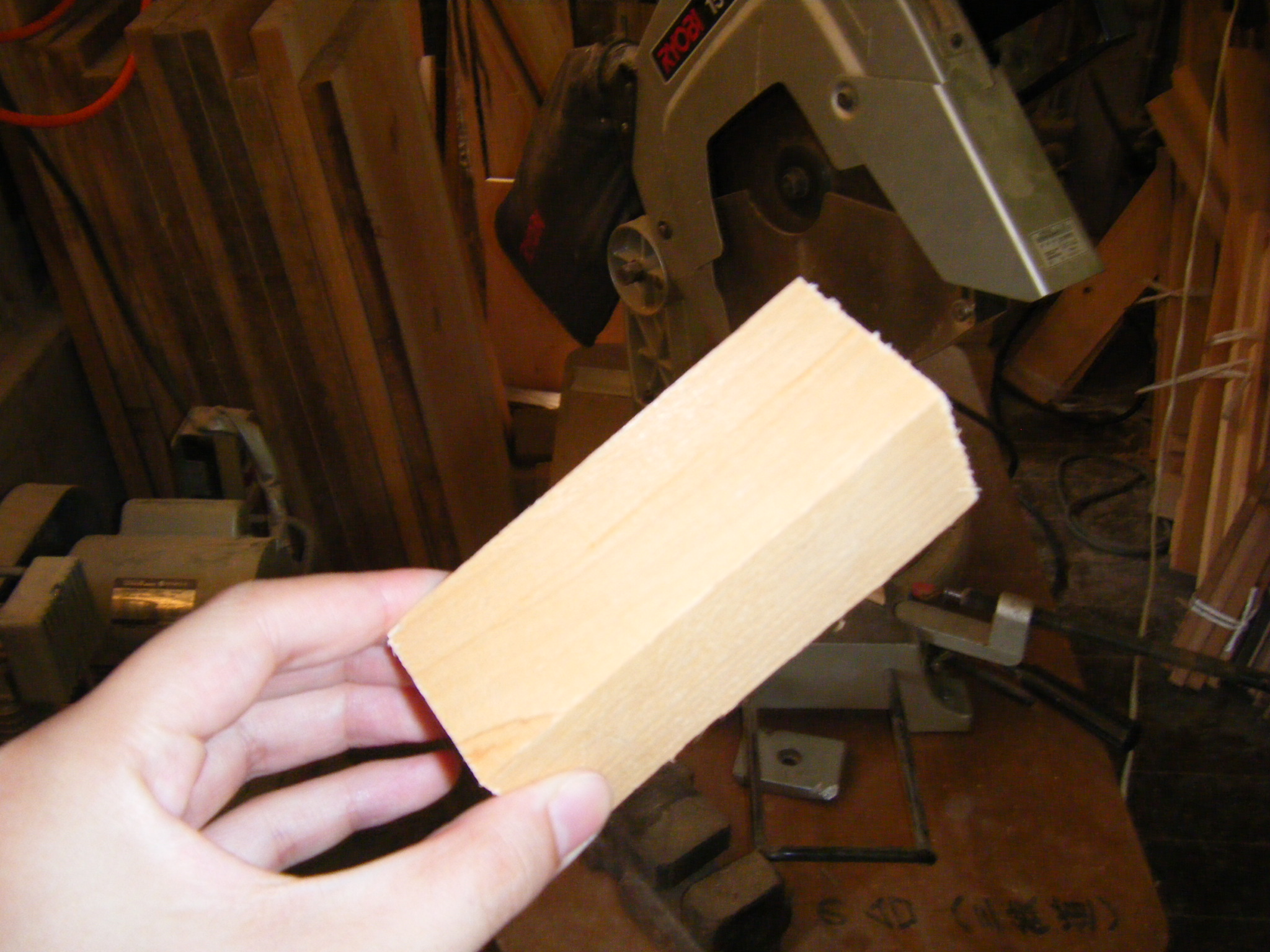 この角材を好きな形に削ってペン立てにしたよ!