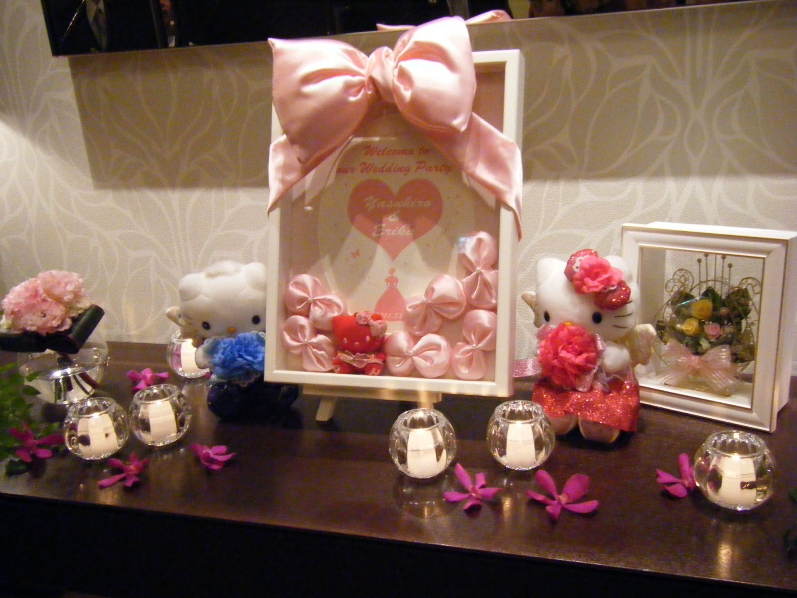 Welcomeボードが手作りで、リボンとキティちゃんがいっぱいの結婚式